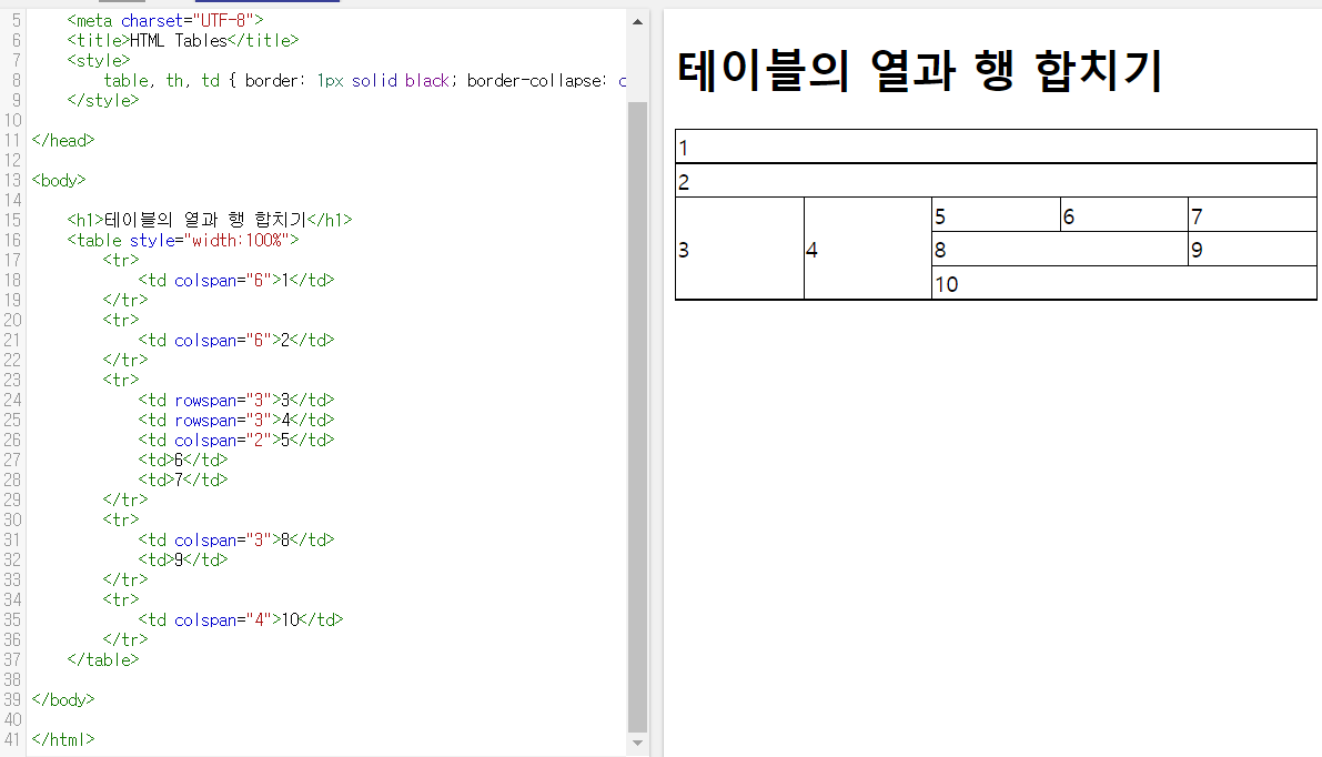 | 행, 행 합치기 (td rowspan="합칠갯수") |