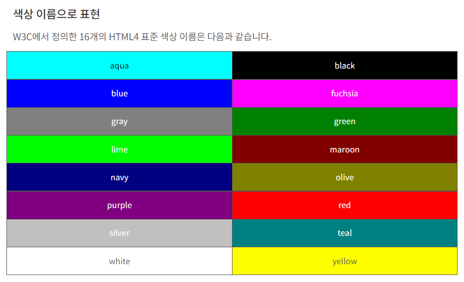 ex) <h1 style="color:blue">색상 이름으로 표현된 파란색</h1>