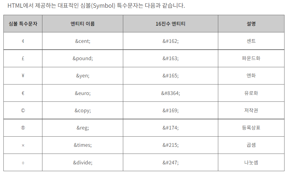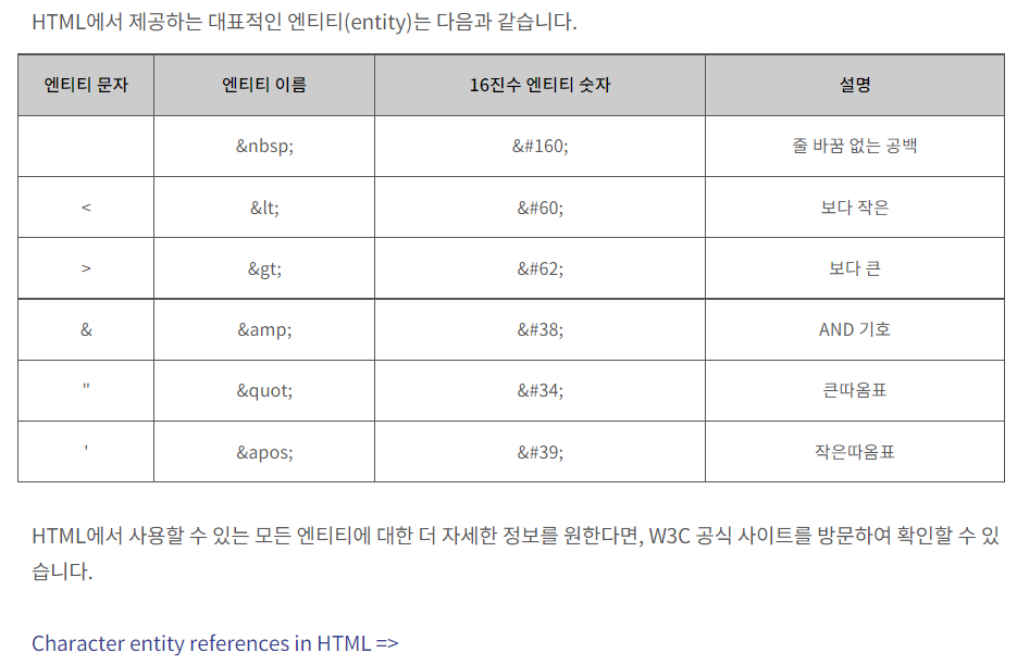 따라서 HTML 예약어를 기존에 사용하던 의미 그대로 사용하기 위해 별도로 만든 문자셋을 엔티티(entity)라고 합니다.