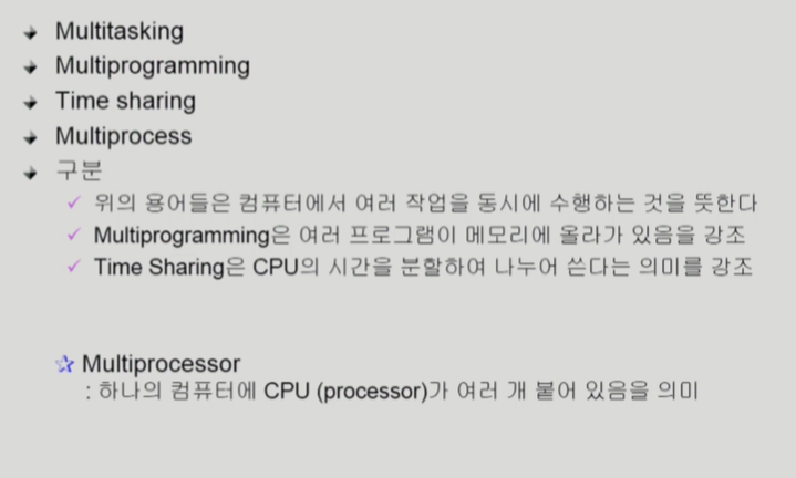 - multiprogramming : 메모리에 여러 프로그램이 올라감. 멀티테스킹과 비슷하나 메모리를 강조