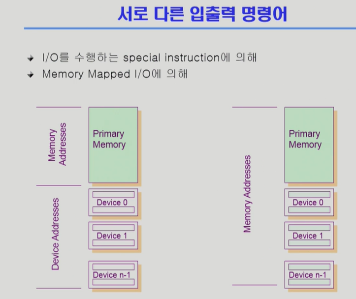 왼쪽 : 일반적인 i/o. 각 io엥 별개의 인스트럭션이 있음. 메모리 접근하는 인스트럭션이 따로 있고 io에는 io에 접근하는 스페셜 인스트럭션이 따로 있음.