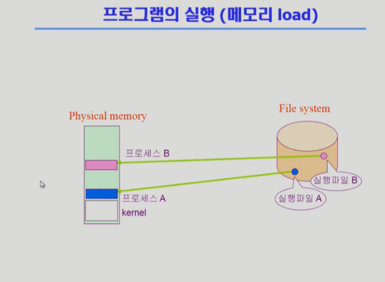 프로그램은 하드디스크에 실행파일 형태로 저장되어 있음 이게 메모리로 올라가면 프로세스가 됨.